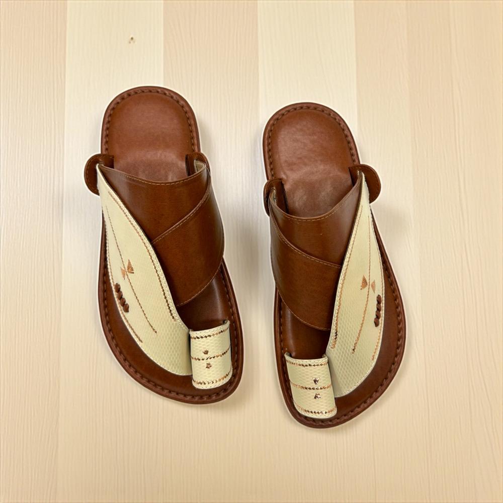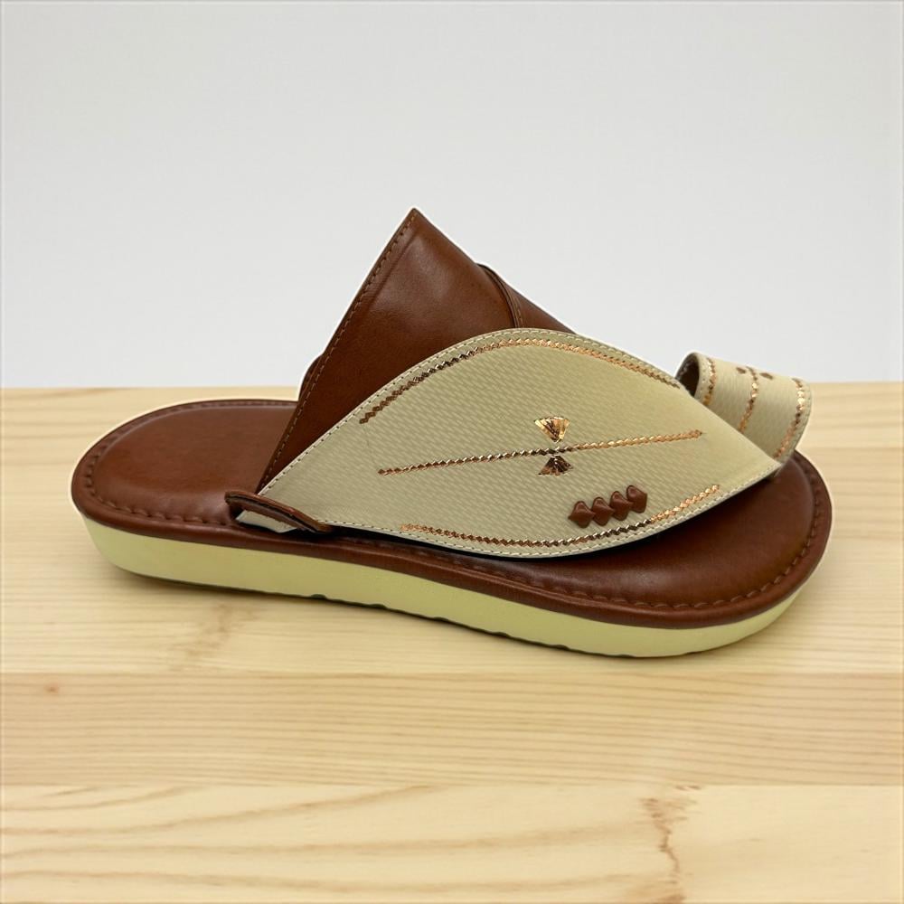 حذاء شرقي بني مع عاجي يمثل قطعة مصممة للرجل الذي يخطو بثقة، ويعرف أن خطواته تحمل إرثًا ثقافيًا غنيًا؛ فالتفاصيل الدقيقة المنقوشة على سطحه هي حروف في أبجدية قديمة، كل غرزة فيها تحكي عن مهارة يدوية متوارثة وعن تقدير عميق للجمال في أبسط صوره وأكثرها صدقًا.